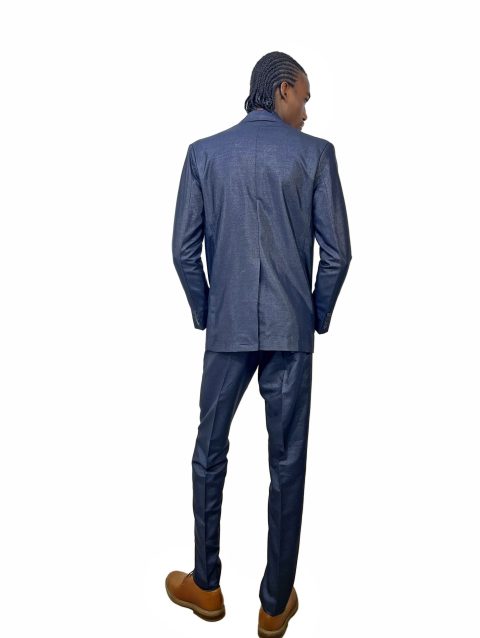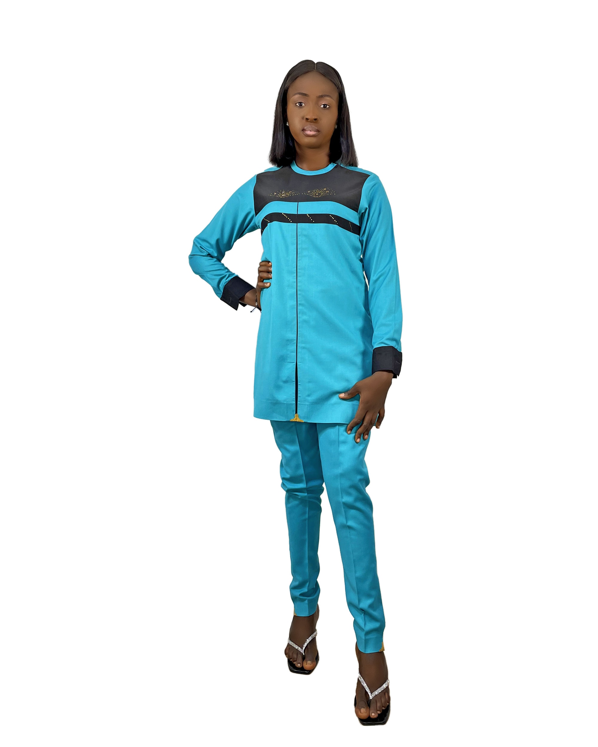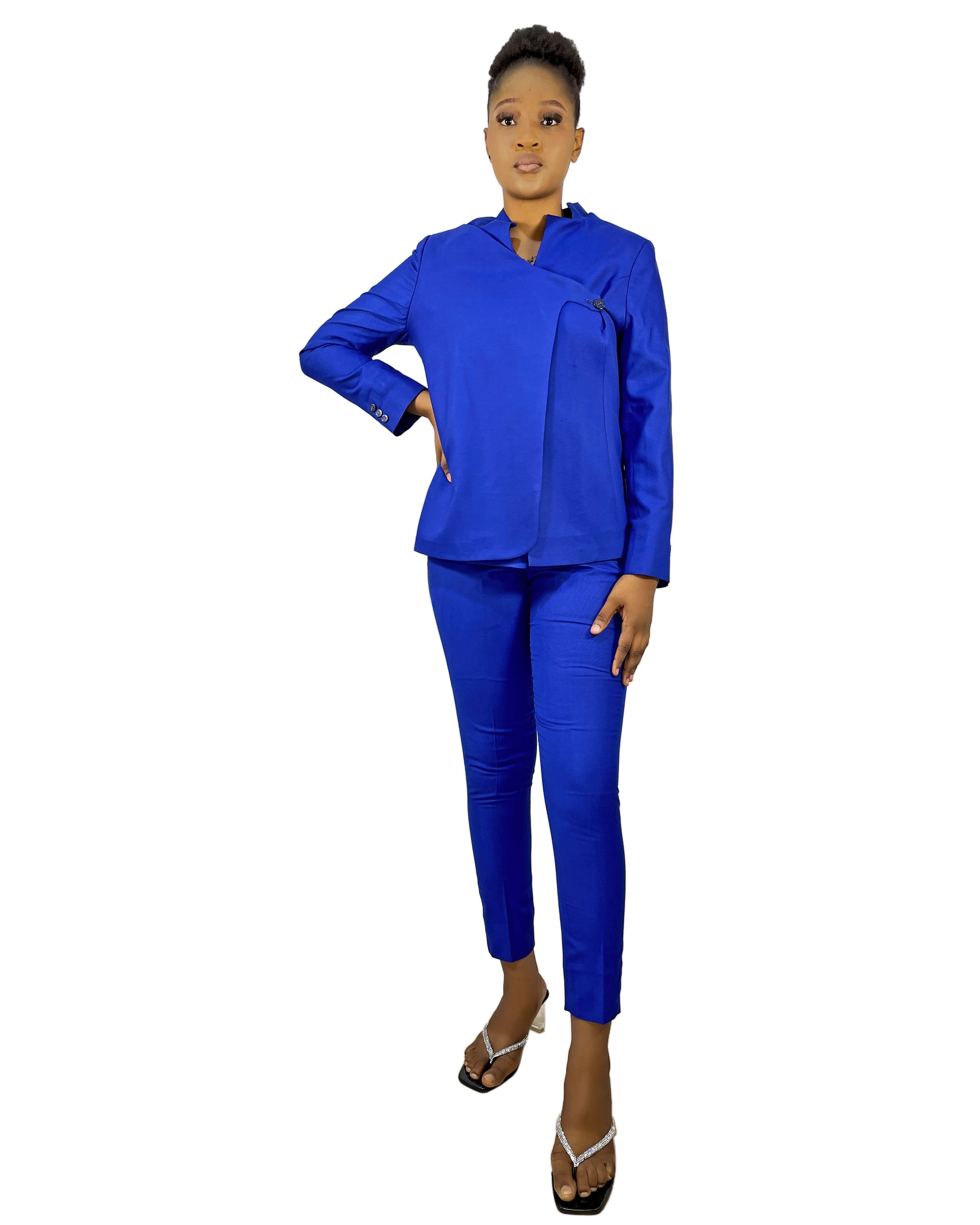 Body Fitted full length trousers and long sleeves single button suit top, with V-Neck frontal.
