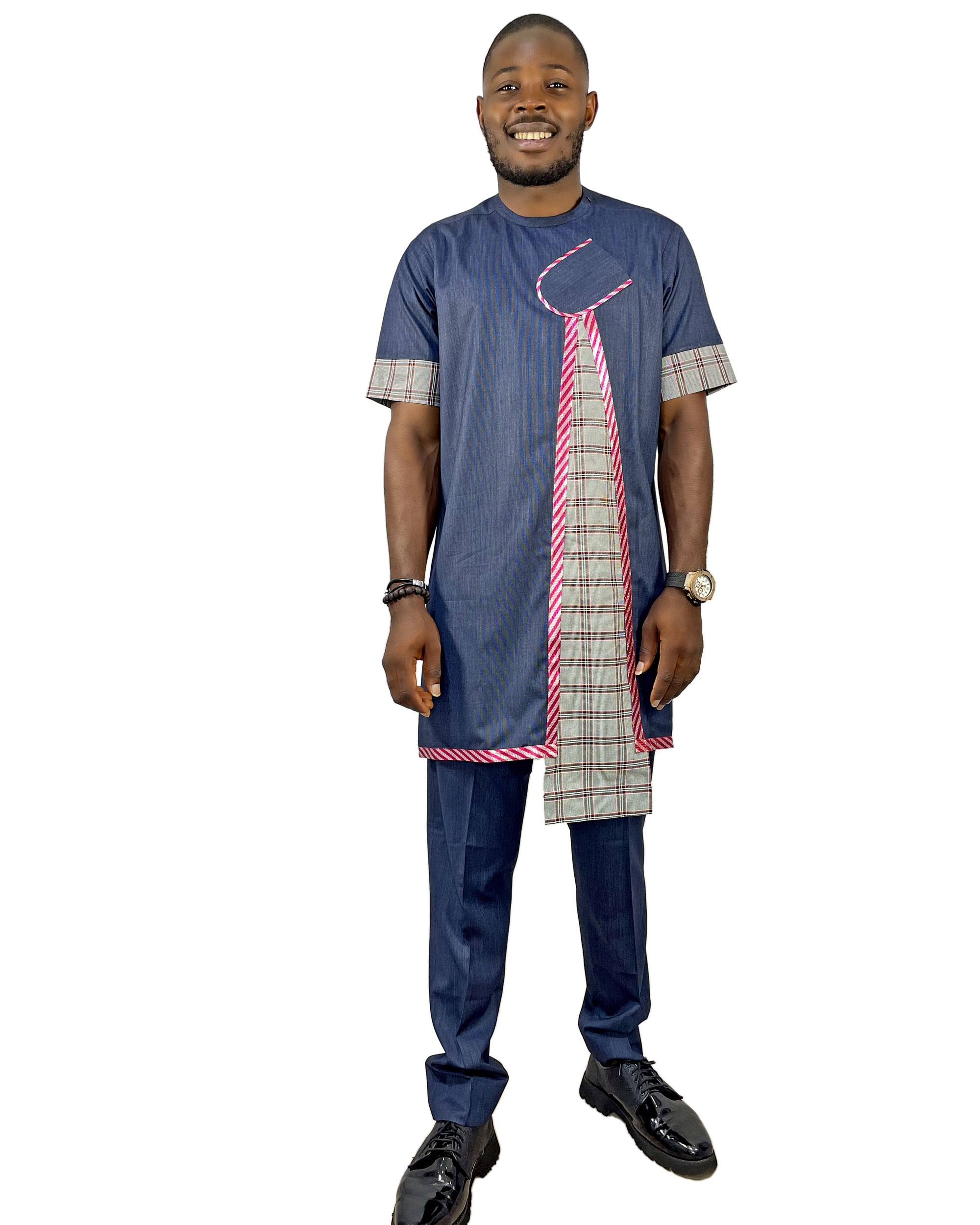 Milk colored design in-between styled blue short sleeves and knee length shirt. Featuring side pockets and full length pants.