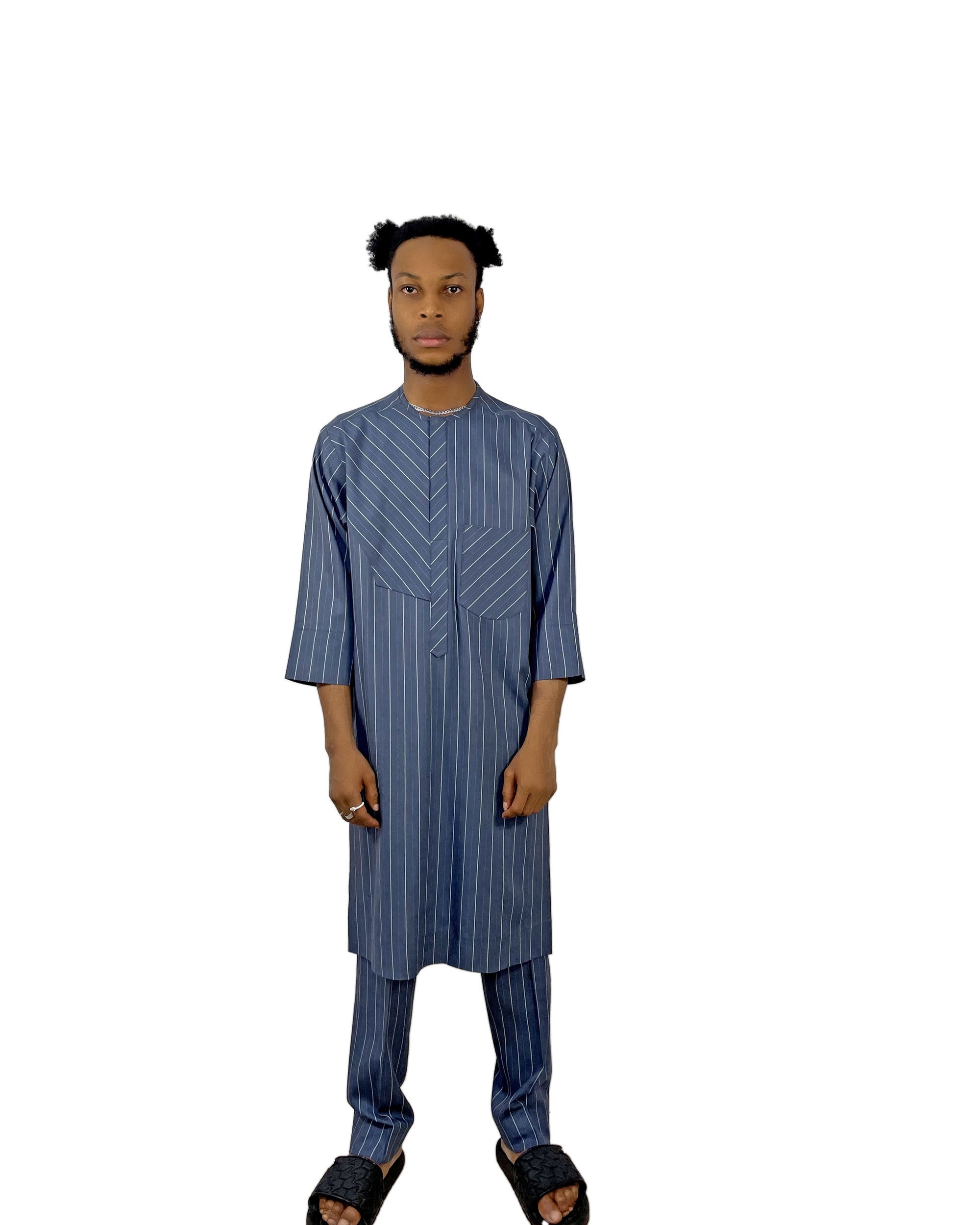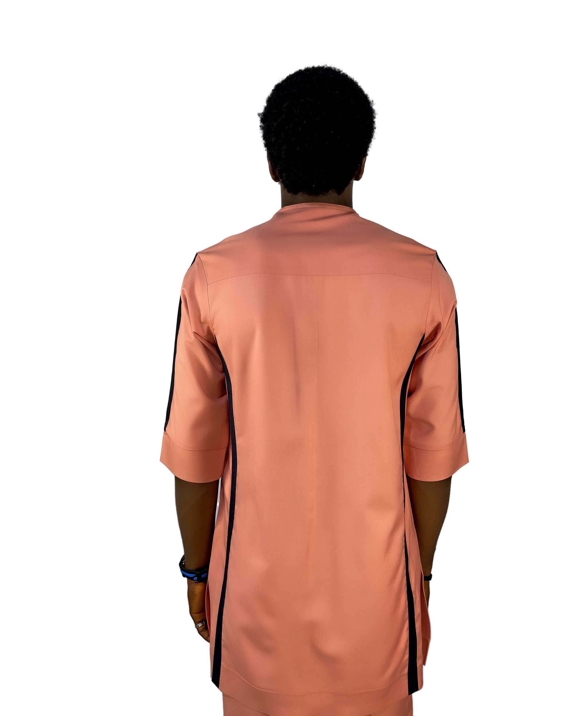 Body fitted elbow length plain pink shirt with blue touches styled, featuring full length trousers. Blues touches layered on shoulder and side, flaunting the essence of sleeves.