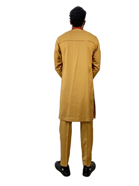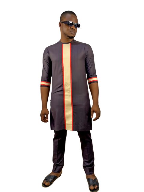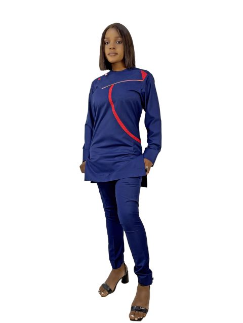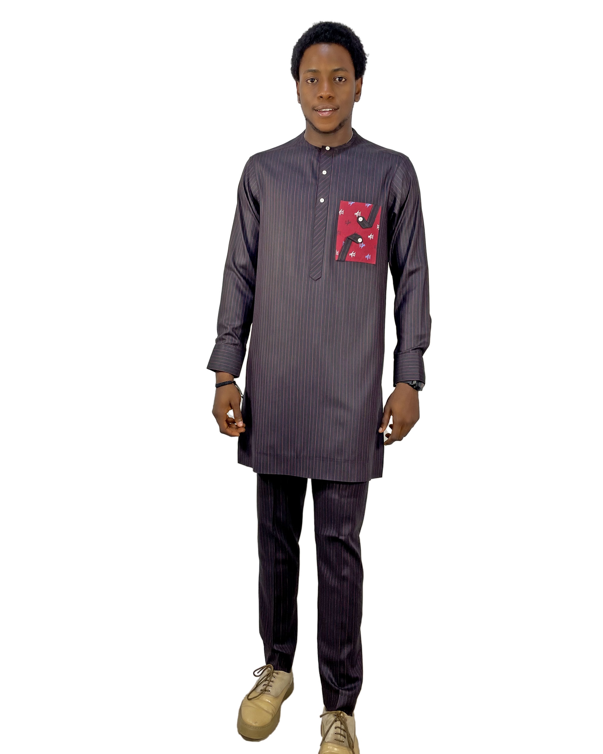 - Long Sleeves extended length shirt with closed round neck, featuring on chest layer white stripe on black material and slim red band. Featuring full length trousers